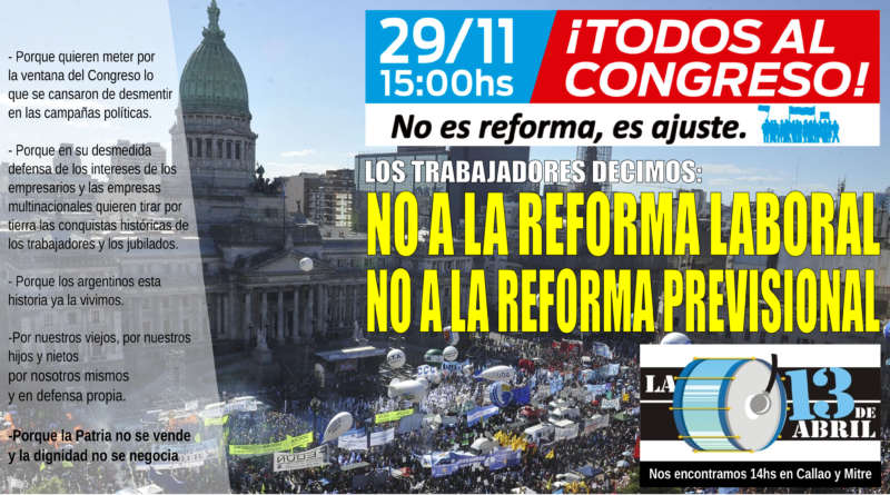 Actividadesdifusion 28 noviembre, 2017 la 13 de abril Facebook Twitter Shares Para marchar en contra de las Reformas antiobreras y anti jubilados nos encontramos a las 14 hs en Callao y Mitre (CABA) Facebook Twitter Shares Para compartirShares