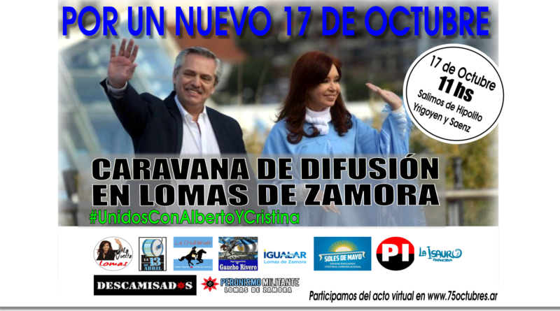 En el día de la Lealtad algunas agrupaciones políticas de Lomas de Zamora decidimos realizar una Caravana de Difusión, manteniendo las condiciones del aislamiento para difundir este hecho histórico y tan vigente en nuestro pais. En apoyo al Gobierno Nacional, para que nuestra Patria siga adelante y sigamos defendiendo la Vida.