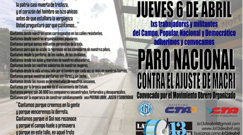 difusion 6 de Abril Paro Nacional contra el Ajuste Macrista 3 abril, 2017 la 13 de abril Facebook Twitter Shares Facebook Twitter Shares Para compartirShares