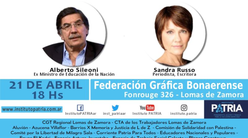 Este viernes 21 a las 18 hs en la sede de la Federación Gráfica Bonaerense en Founrouge 326 en Lomas de Zamora y en el marco del ciclo de charlas que la Comisión de Educación del Instituto Patria está realizando en diferentes localidades se realizará la charla sobre “La Educación como uno de los pilares sobre los que Milagro Sala construyó organización popular” con la Participación del Ex Ministro de Educación de la Nación, Alberto Sileoni y la Periodista y Escritora Sandra Ruso.